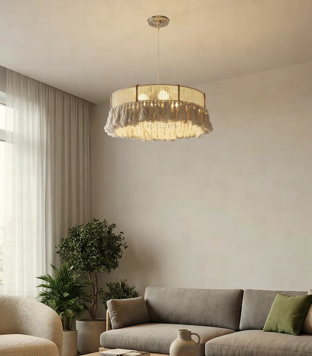 A stylish ceiling pendant light made from natural macrame threads, featuring a simple geometric design that brings warmth and character to any room. The open-weave structure allows light to diffuse softly, creating a cozy and inviting atmosphere — perfect for living rooms, bedrooms, or boho-inspired cafés.