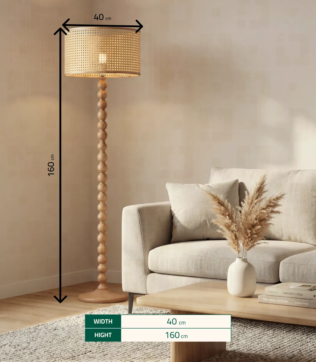 Elegant floor lamp with a natural design that combines simplicity and sophistication. The base and stand are made of high-quality wood, providing both stability and warmth. The lampshade is decorated with natural rattan , adding a charming rustic touch that complements both modern and classic interiors. Perfect for living rooms or bedrooms to create a cozy and inviting atmosphere.