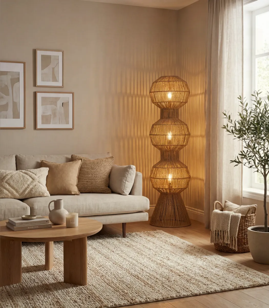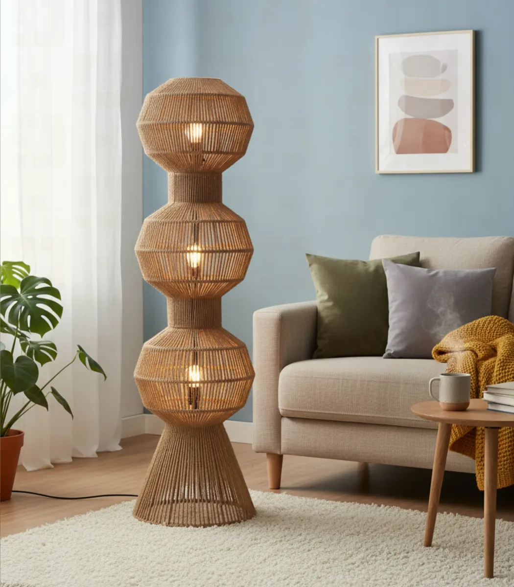 This floor lamp features an elegant handcrafted design, made from natural threads wrapped around a sturdy metal frame, giving it a modern geometric shape with a warm, rustic touch. The open-thread structure allows soft, ambient light to diffuse beautifully, creating a cozy and calming atmosphere in living rooms, bedrooms, or any decorative corner. Lightweight yet stable, it serves as both a functional lighting piece and a stylish décor element.