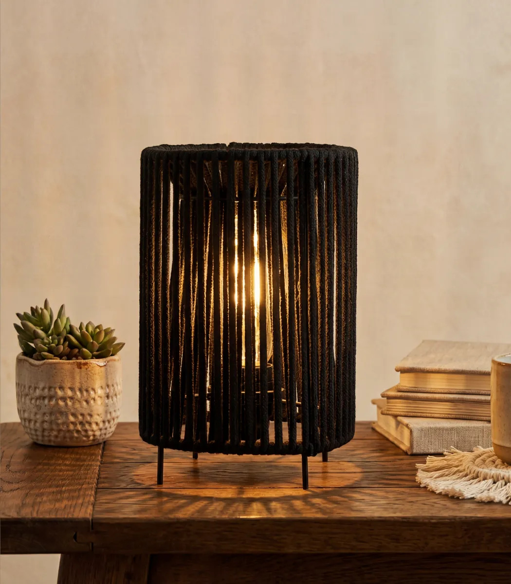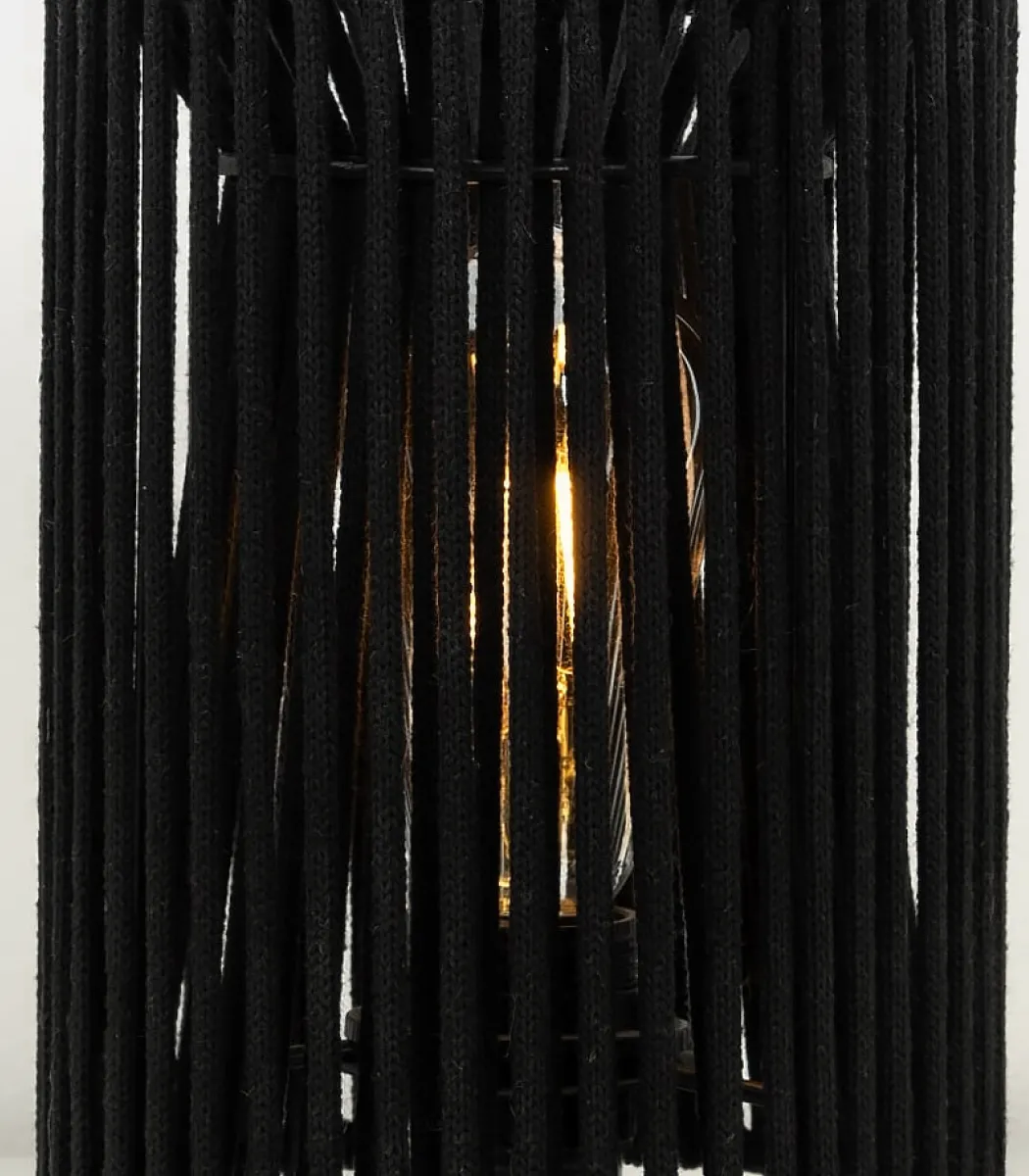 A stylish table lamp light made from natural macrame threads, featuring a simple geometric design that brings warmth and character to any room. The open-weave structure allows light to diffuse softly, creating a cozy and inviting atmosphere — perfect for living rooms, bedrooms, or boho-inspired cafés.