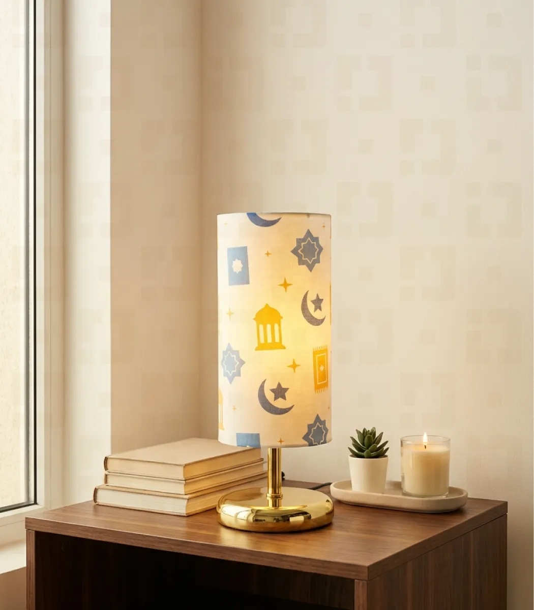Illuminate your space with the enchanting glow of the “Mystic Nights” table lamp. This piece perfectly blends traditional motifs with a sleek, contemporary aesthetic esign: The drum shade features a captivating celestial pattern Base: Supported by minimalist silver-toned hairpin legs, providing a modern contrast to the intricate pattern of the shade.Versatility: Whether you’re looking for a cozy bedside light or a statement piece for your living room, this lamp adds a touch of elegance. It is also an ideal decor piece for festive occasions like Ramadan.Atmosphere: Creates a warm, serene ambiance, making it a perfect gift for those who love celestial themes or bohemian-inspired interiors.