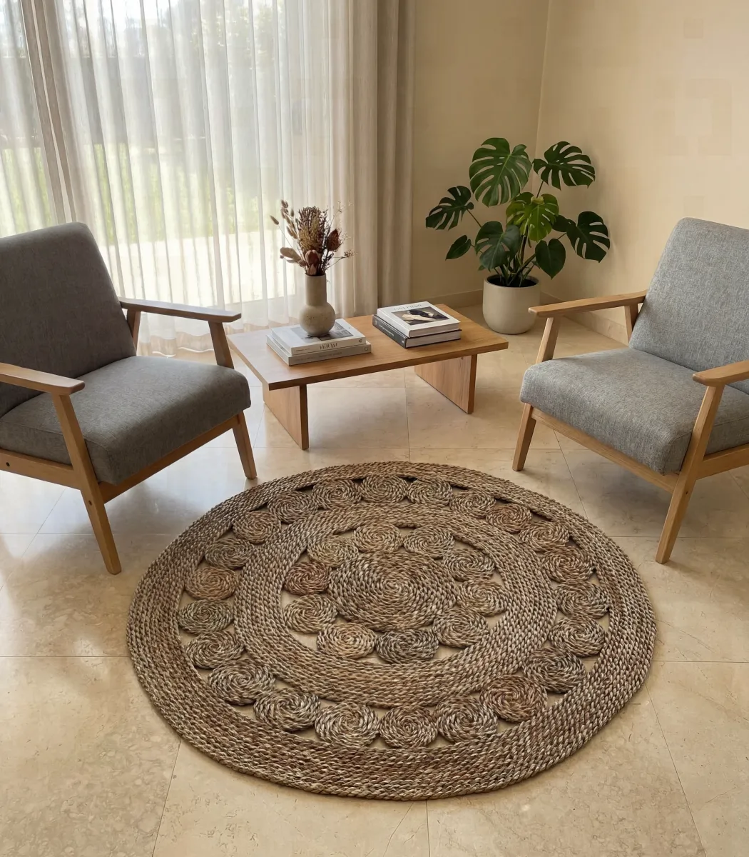 Sala unveils the Round Rug, a sophisticated décor piece shaped with artistic precision. Featuring elegant Fiber texture and a soothing Beige palette, it blends effortlessly with interiors. An expressive finishing touch that reflects refined taste and stylish simplicity.