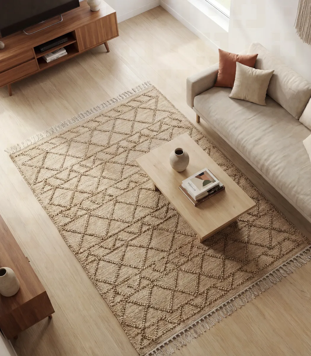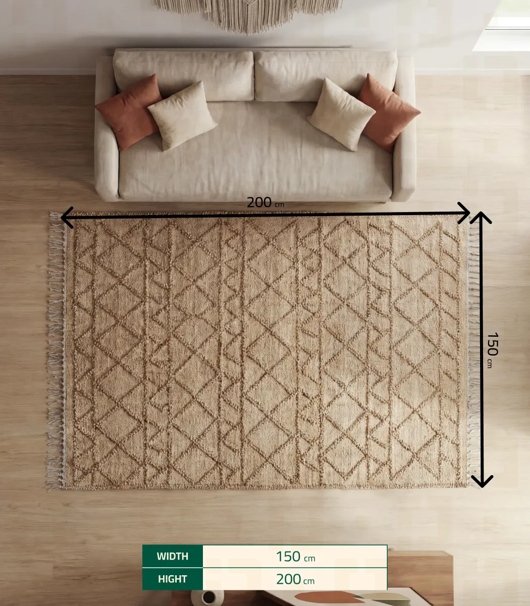 Rufaida unveils the Wool Rug, blending contemporary aesthetics with subtle character. The combination of premium Fiber and elegant Beige hues delivers a sophisticated feel. A refined statement designed to enhance everyday moments.