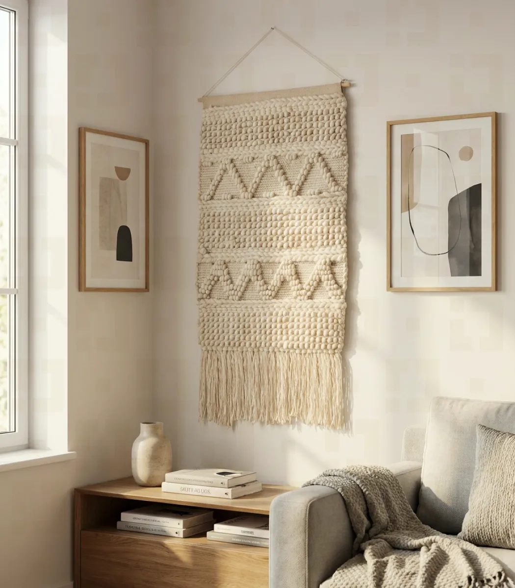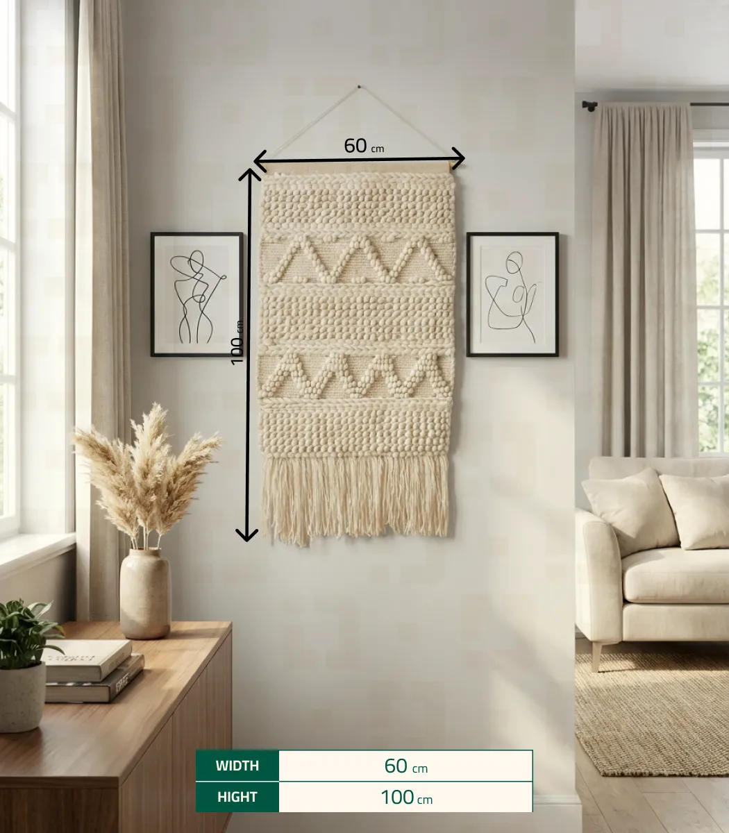 Rufaida introduces the wool wall rug, a sophisticated wool wall rug created for elevated spaces. Designed with meticulous attention to detail, its soft Fiber and wood surface and subtle Off white shades elevate the surrounding space. A premium wall accent designed to elevate interiors with artistic luxury.