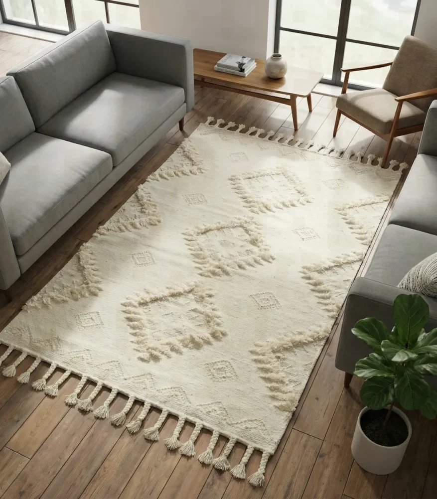 Rufaida introduces the Wool Rug, designed to elevate interiors with timeless sophistication. The combination of high-quality Fiber and elegant Off white hues creates a calm, luxurious presence. A timeless piece created to enhance spaces with quiet confidence.